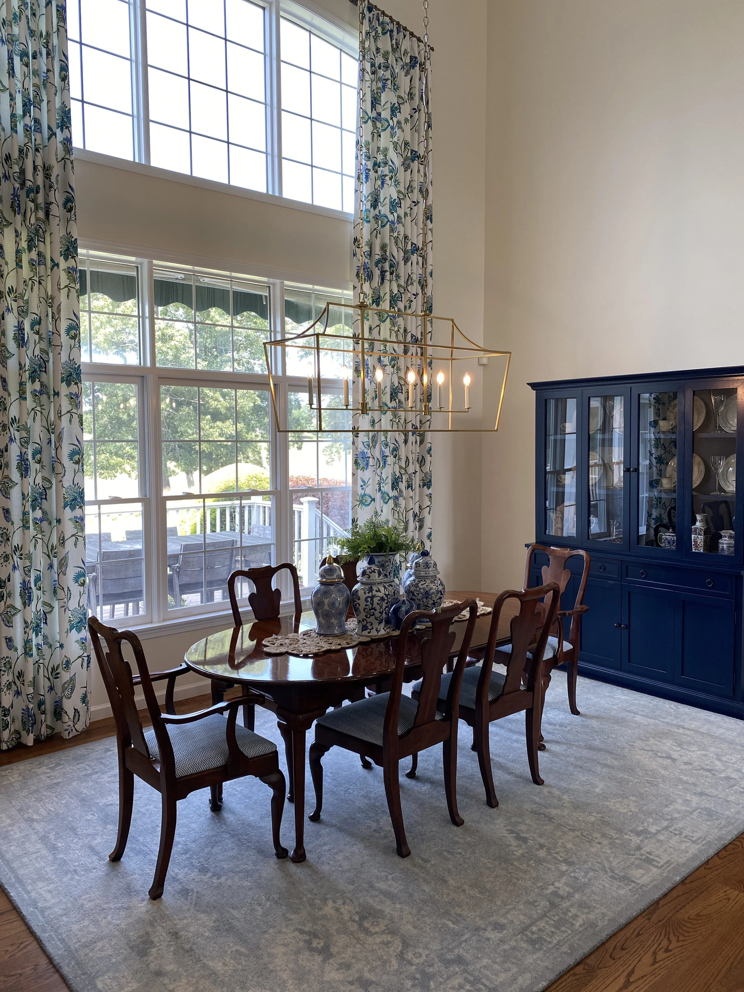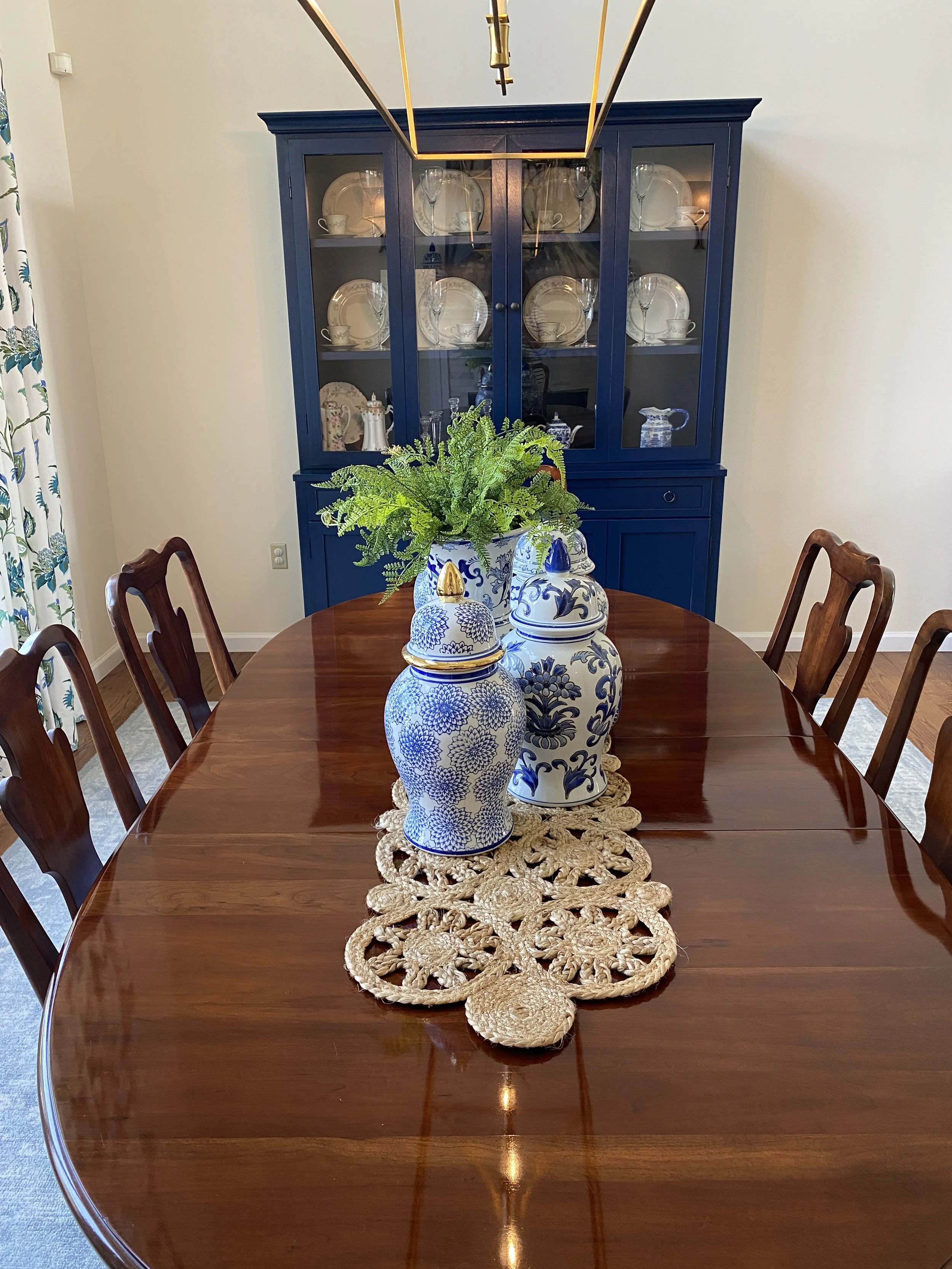 A deep blue hutch showcases the blue and white china collection, bringing color, history, and personality to the room while anchoring the refreshed dining space.