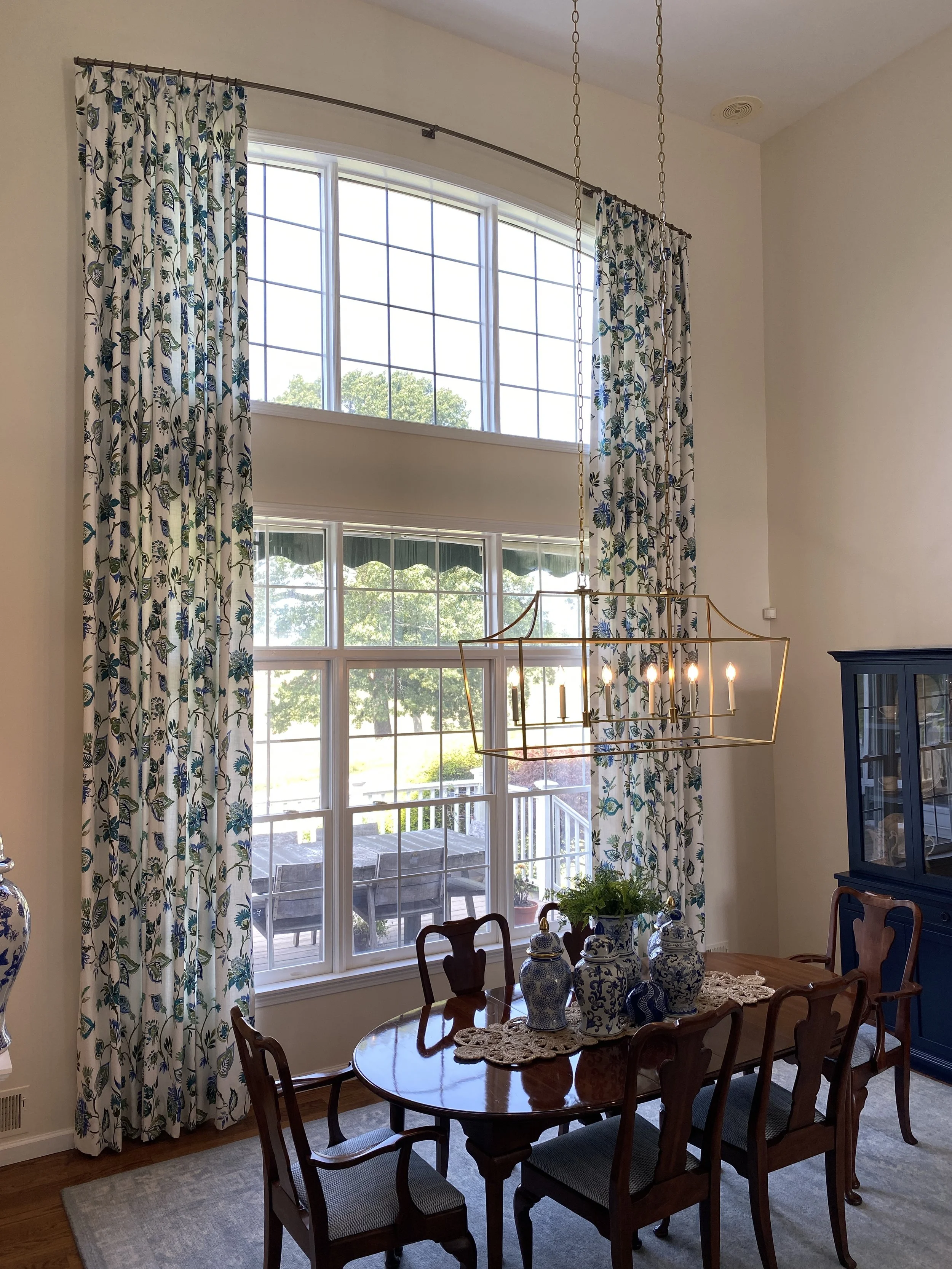 Custom 22-foot window treatments frame sweeping golf course views while softening the dramatic ceiling height, creating a dining space that feels both elegant and inviting for everyday gatherings.